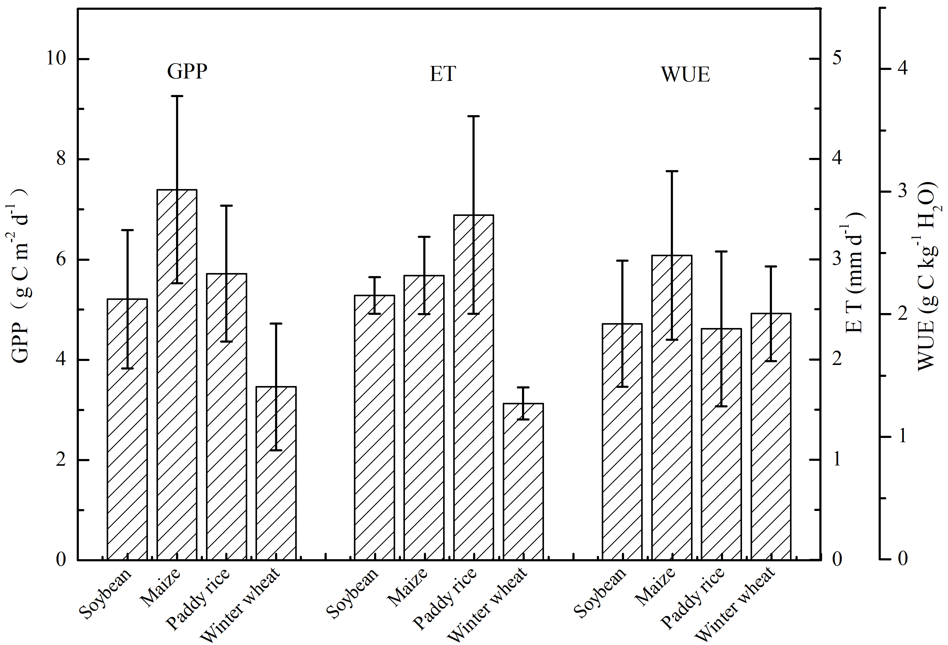 针对这一问题,汤旭光小组收集了利用涡动相关观测技术获取的10个农田站共33个站点年通量数据,系统地评价了大豆、玉米、冬小麦和水稻四种主要农作物总初级生产力(GPP)、蒸散发(ET)和生态系统水分利用效率(WUE)年际和季节动态。从时间序列MODIS NDVI数据提取的主要作物生育期长度表明,冬小麦生育期最长,稻田生育期最短。进一步分析表明,玉米农田生态系统水分利用效率最高,为2.48±0.69 g C kg-1 H2O,其次是冬小麦(2.00±0.39g C kg-1 H2O)、大豆(1.92±0.52 g C kg-1 H2O)和水稻(1.88±0.63 g C kg-1 H2O)。同时,生态系统水分利用效率的变化呈现出明显的季节性,在最活跃的夏季与GPP一起达到峰值。一系列生物和非生物因素影响GPP、ET以及WUE变异性。鉴于这些环境因素之间复杂的相互作用,本研究揭示了利用时间序列MODIS NDVI数据在大面积遥感反演WUE季节动态的巨大潜力。C4作物-玉米的生态系统水分利用效率明显高于其他三种C3作物。