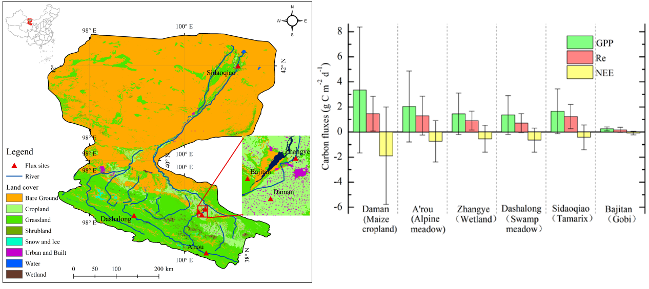 针对该问题,汤旭光小组基于我国西北部黑河流域农田、草地、草甸、湿地、柽柳和戈壁等6个通量站涡动观测数据、气象数据及遥感数据,定量评估了该区域各典型生态系统碳通量的季节动态及主要环境控制因子。研究发现,1)各生态系统都表现出一定的碳汇潜力,农田碳汇能力最强,其次是草地、湿地、高寒草甸、柽柳和戈壁;2)除戈壁外,其他生态系统都表现有明显的动态季节变化,总初级生产力(GPP)和生态系统呼吸(Re)从春末到初秋初夏达到峰值,净碳交换NEE则相反;3)戈壁在春、夏和秋三季中都表现为一定的碳汇功能,但夏季较弱;4)在干旱地区,土壤水分含量成为陆地-大气碳通量的胁迫因子,并被视为水文和生态过程之间的关键桥梁。