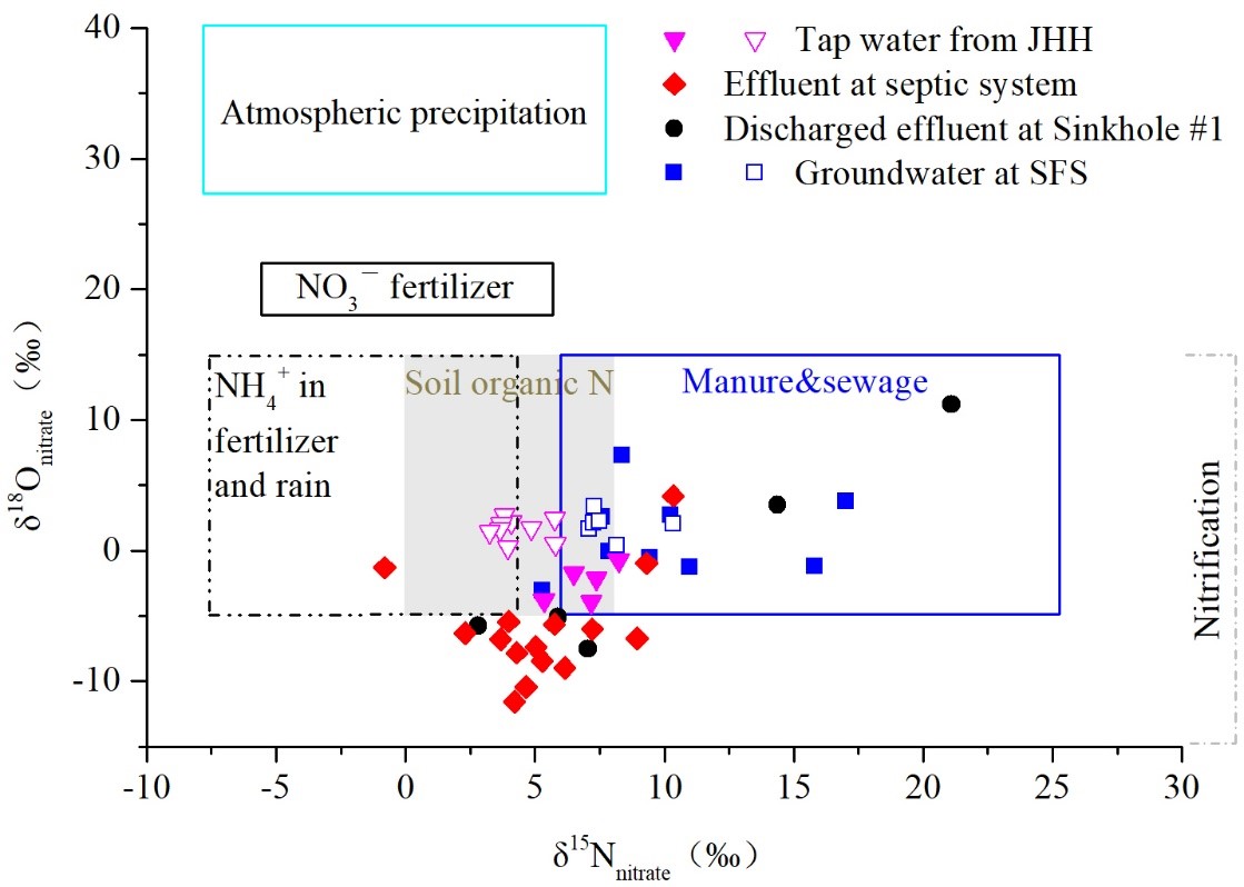 近几十年来,地下水硝酸盐污染成为国内外最普遍、污染面积最大的地下水污染问题,威胁着生态环境和人类的供水安全。水体硝酸盐污染最显而易见的危害就是水体富营养化。人类饮用过高硝酸盐浓度的水会引起高铁血红蛋白症、癌症、基因损坏和甲状腺肿大等疾病,严重威胁人类的生命健康。而在喀斯特地区,由于地下水流系统具有高渗透性的特征,地下水极易受到硝酸盐的污染,且难以治理。基于此,taptap点点杨平恒教授课题组在前期十余年野外观测研究工作的基础上,对位于金佛山喀斯特世界遗产地内的水房泉小流域地下水硝酸盐及其同位素开展了2个水文年的监测,从地下水硝酸盐补给、径流和排泄的角度研究了地下水氮循环机理。