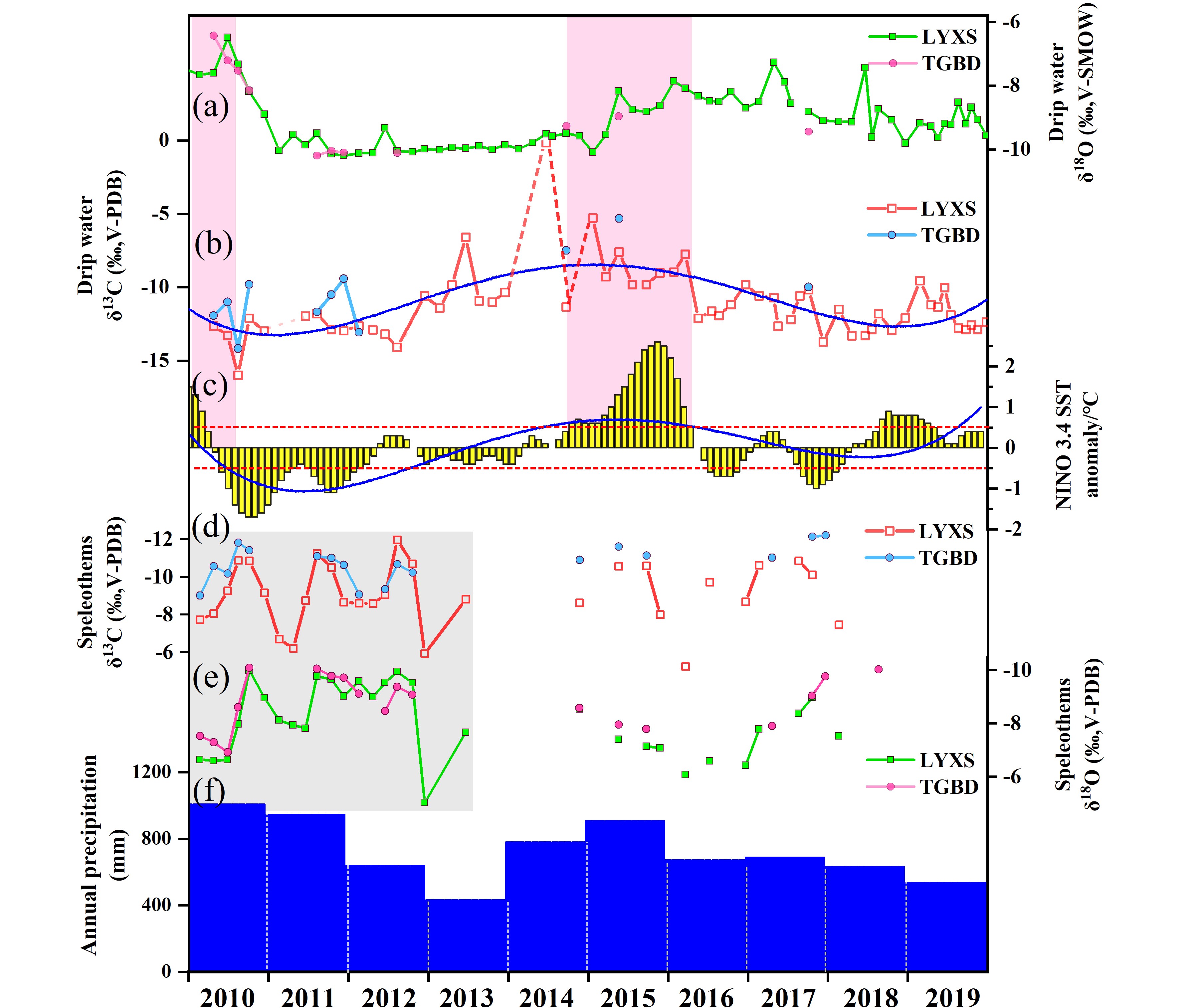 在连续4个国家自然科学基金项目(40902053、41372177、41672160、41877450)的支持下,从2009年10月至今,杨琰教授研究小组对我国南北交汇带秦岭余脉伏牛山北麓河南西部洛阳栾川鸡冠洞进行连续11年的监测。论文通过分析洞穴系统各部分碳同位素和洞穴水微量元素组成,并与附近东石崖洞近70年来石笋δ13C记录进行对比,研究发现:(1) 洞穴水δ13CDIC具有明显的季节和年际变化。夏季相对较高的土壤CO2以及洞内空气停滞导致洞穴水δ13C值偏负,冬季则相反。年际尺度上,洞穴水的碳同位素和微量元素比值反映了外界气候的干湿状况,对夏季风降水减少引起的极端干旱事件敏感 (图1)。(2) δ13C信号在岩溶洞穴系统(植被-土壤-滴水-沉积物)运移过程中不断富集,虽然滴水δ18O和δ13C都可以响应ENSO,但驱动机制不同。滴水δ13C反映受ENSO影响的降水量变化,而滴水δ18O反映与环流效应相关的降水δ18O水汽源的变化。由ENSO间接影响的滴水δ13C的变化可以同步转移到现代沉积物上 (图2)。(3) 毗邻东石崖洞石笋δ13C指示当地水文气候条件的变化并间接反映ENSO。ENSO通过降水量变化影响地表植被、生物量、土壤CO2产率和表层岩溶带及洞穴过程导致石笋δ13C变化 (图3)。