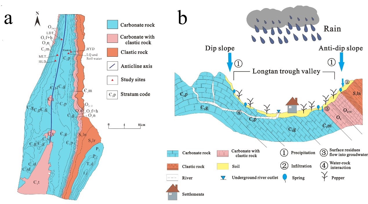 国家重点研发计划专题项目酉阳龙潭槽谷区水资源动态变化及环境效应研究(批准号:2016YFC050230205)和国家自然科学基金项目(41975114)等的支持下,从2017年至今,杨琰教授课题组国家石漠化综合治理重点县重庆市酉阳进行了连续4年的监测。前人研究发现岩层倾角、倾向关系等都会导致顺/逆坡的植被覆盖程度不同;由于顺坡水土流失比逆坡严重,造成顺坡地区大面积裸露基岩发育,侵蚀影响显著。同时,岩层倾角对地表水力特征有重要影响,导致岩溶槽谷水土流失空间分布的差异。在本研究区重庆酉阳龙潭槽谷的顺/逆坡土壤覆盖、植被覆盖差异明显(图1, 2)。因此,在相同的气候条件下,利用碳同位素研究喀斯特石漠化槽谷区植被恢复差异造成的水文生态机制及环境效应具有重要的理论及现实意义。本成果以重庆市酉阳县龙潭槽谷泔溪镇的石漠化重点治理区为研究点(图1, 2,从20171月至201912月,监测顺/逆坡的表生泉、坡面流和土壤水中pH值、电导率、δ13CDIC、阴阳离子浓度、δ18OδD等环境指标。另外,在强降雨条件下,对顺/逆坡不同植被覆盖区域地下水和坡面流的碳同位素等指标变化进行了详细的研究。