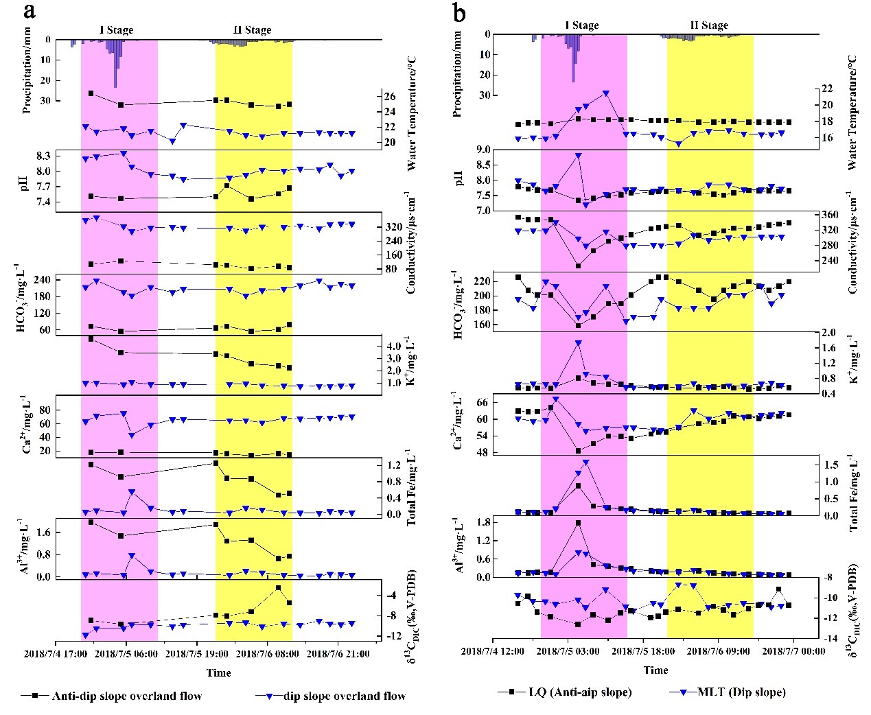 3 (a) 201874-77日强降雨过程中喀斯特槽谷坡面流δ13CDIC和水化学元素的变化特征; (b) 201874-77日强降雨过程中喀斯特槽谷顺/逆坡地下水δ13CDIC水化学元素的变化特征