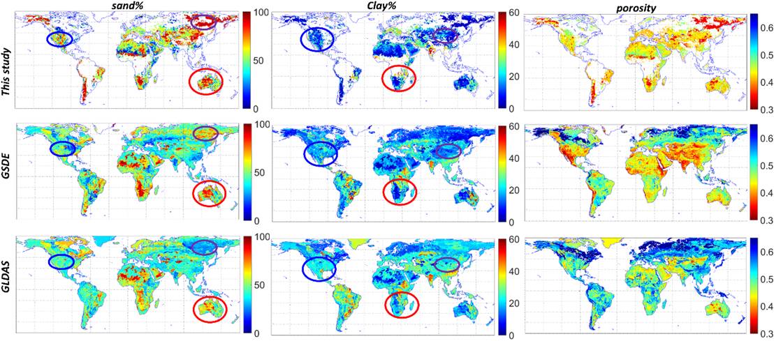 准确的含沙量、孔隙度等不同土壤类型下的土壤质地参数在陆面模型和卫星遥感反演中起着决定性作用。而受限于有限的采样数目,现有区域和全球土壤类型或土壤质地参数产品存在较大不确定性。本研究以SMAP卫星土壤水分产品为参照,通过最小化与Noah-MP陆面模型估计的表层土壤水分之间的差异,获得了全球格点化土壤类型的优化估计。与GLDAS默认土壤质地和中山大学开发的具有较高可信度的全球土壤质地数据集(GSDE)对比发现(图1-2):本研究所得到的土壤含沙量、粘土含量、以及土壤孔隙度等空间分布合理,且在部分区域与GSDE更为接近。