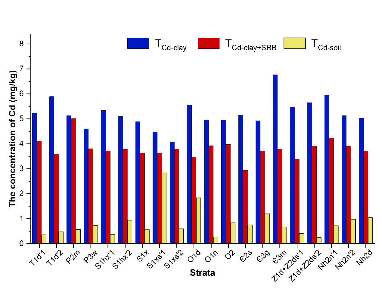 图1 土壤(TCd-soil),粘粒(TCd-clay)及其添加SRB后(TCd-clay+SRB)的Cd含量