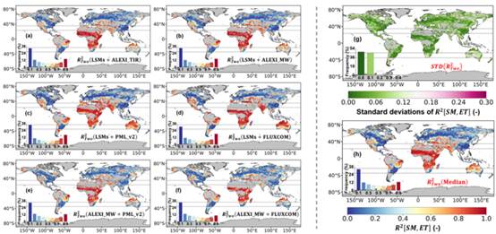 图2. 不同数据组合下“双源”方法估计得到的土壤水分-蒸散发耦合强度分布图,a-f为用于集成最终结果h的数据组合,g为对应的标准差