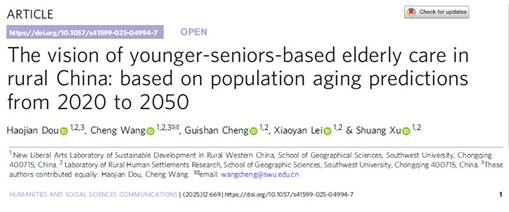 近日,公司王成教授课题组在《人文社科通讯》(Humanities & Social Sciences Communications)发表了题为“The vision of younger-seniors-based elderly care in rural China: Based on population aging predictions from 2020 to 2050”的研究论文(图1)。该研究基于中国2020年至2050年乡村人口老龄化趋势预测结果,揭示了乡村老年人口增长趋势和空间异质性、提出了“以老养老”愿景,并在全球尺度论证了其适用性和可行性,该理念对积极应对农村老龄化、实现可持续发展目标具有重要意义。