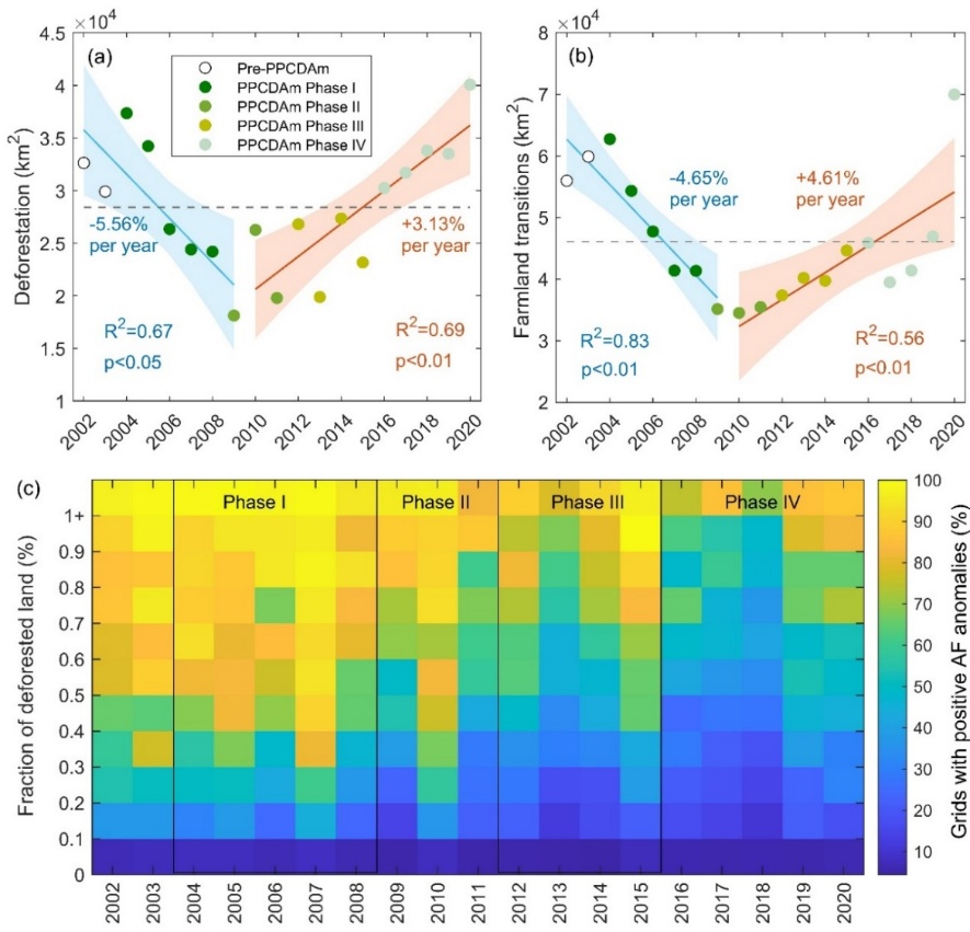 针对这一核心科学问题,研究基于2002-2020年卫星火点数据、土地覆盖变化及气候再分析数据集开展多尺度解析,并通过构建的空间回归模型定量揭示人为主导作用:毁林平均每增加1%导致火灾上升0.67%(贡献率为干旱的13倍),叠加农田扩张效应,人类活动合计驱动约87%的火灾风险。尽管反毁林行动计划(PPCDAm)实施后,毁林对火点频次正异常贡献的占比从68.9%降至41.4%,但在PPCDAm后期农田仍以每年4.61%速率持续扩张并侵蚀森林(P<0.01)(图1)。研究揭示亚马逊地区“毁林-农田转换-林火扩张”的协同趋势演化机制:森林损失主要源自农业扩张的需求(过去二十年新增的50万平方千米农田中约90%直接源于森林覆盖),而火是焚毁森林或清理采伐迹地次生植被的核心手段。伴随道路网络扩张形成的“鱼骨状”森林破碎化景观,通过边缘效应进一步刺激了毁林与农业活动,加速火点向雨林腹地蔓延(图2)。因此,亟需跨境协同治理机制阻断此反馈链。
