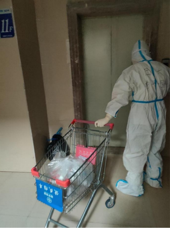 登记完信息,杨老师穿上“大白服”,被分配到疫情严重的楼栋,运送生活物资和清理垃圾。
