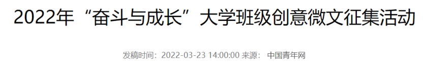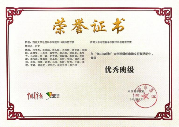 在中国青年报社指导下,中国青年网组织开展了2022年“奋斗与成长”大学班级创意微文征集活动,面向广大高校员工征集以“奋斗与成长”为主题的微信文章。taptap点点2019级地理科学(师范)三班的同学一同努力,积极参与了此次活动的评选。
