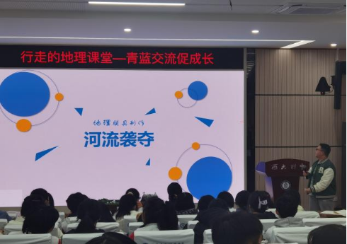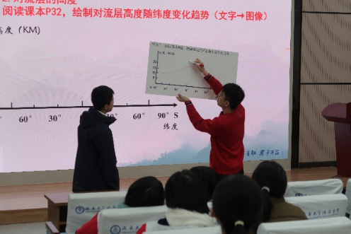 丁明军同学以溯源侵蚀的实验视频作为导入,对河流袭夺地理模具展开介绍,鼓励同学们积极动手实践,让更多的地理知识“活”过来。