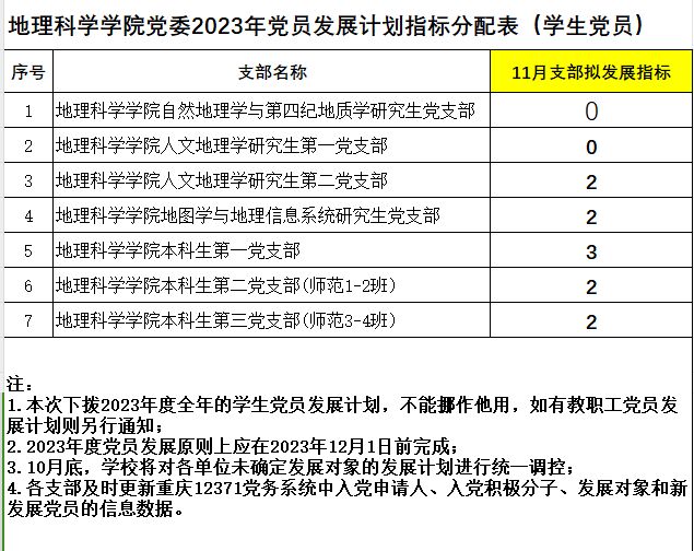 地理科学公司党委2023年11月党员发展计划指标分配表(员工党员)